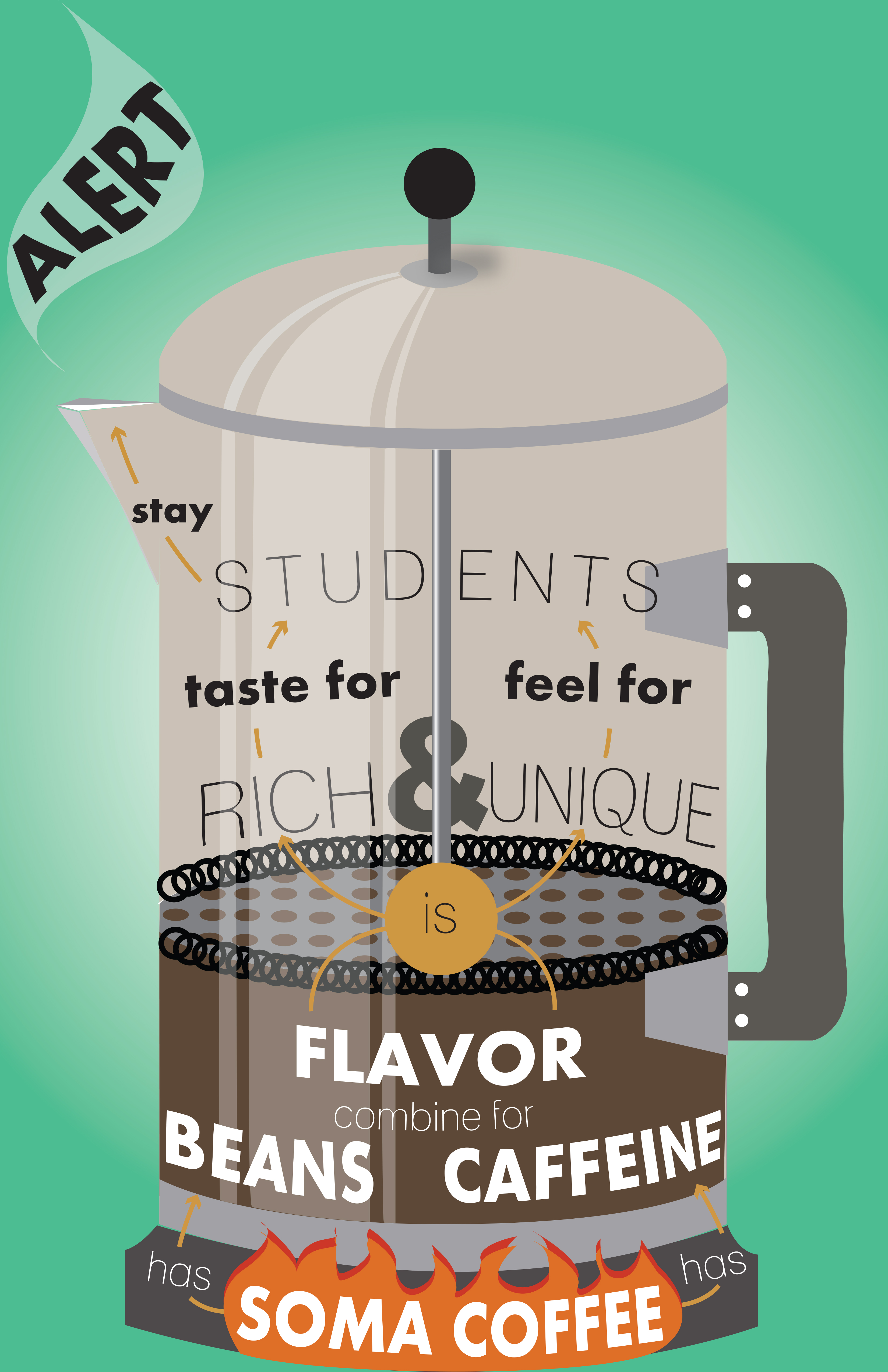 My first task was to visit Soma multiple times and take field notes of the space. I was to then encompass my findings into a concept map that delivered a message about the space through copy and design. I created the following graphic as a way to highlight the bright colors of the space and explain the atmosphere that surrounded Soma. Click into the image for a full sized version!